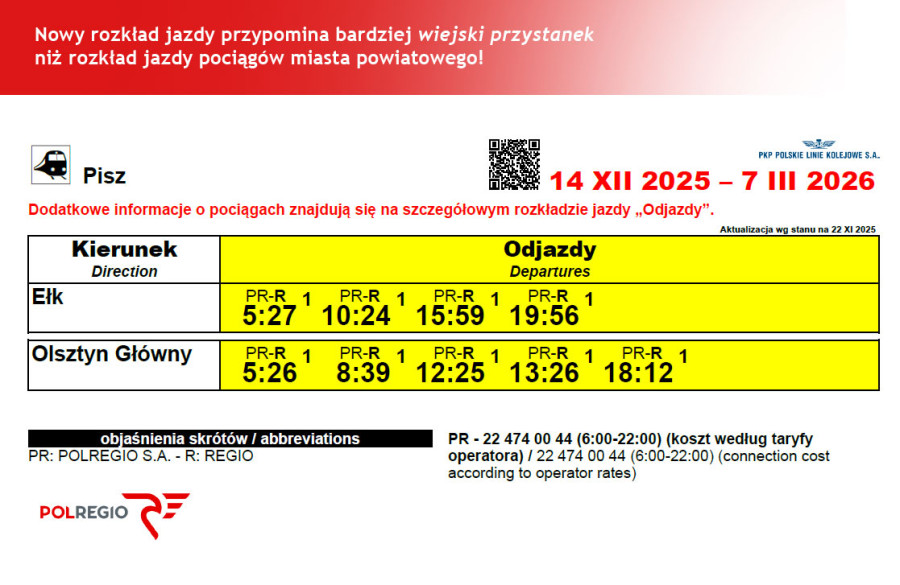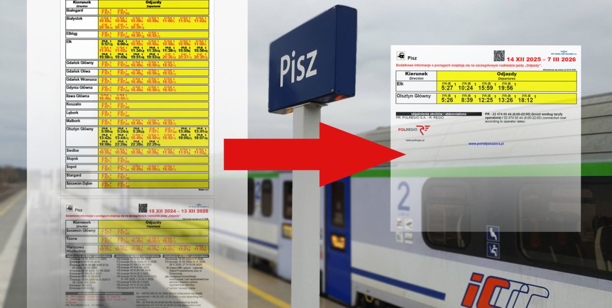 W nowym rozkładzie jazdy, który wejdzie w życie 14 grudnia 2025 roku, spółka Polregio obiecuje zwiększenie pracy eksploatacyjnej na Warmii i Mazurach, jednak nawet pobieżna analiza nie wskazuje na znaczące zwiększenie liczby połączeń na samym odcinku Pisz – Olsztyn, lecz raczej na dostosowanie godzin kursowania do pociągów innych przewoźników.