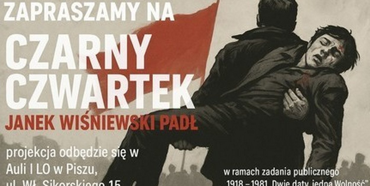 Dziś (4 grudnia) o godz. 17.00 Stary Ogólniak w Piszu zaprasza w swe progi na projekcję filmu "Czarny Czwartek. Janek Wiśniewski Padł". Film wyreżyserowany przez Antoniego Krauze opowiada o tragicznych wydarzeniach na Wybrzeżu w grudniu 1970 r. i jest pierwszym z cyklu otwierającym realizację projektu „1918–1981. Dwie daty, jedna Wolność”.
