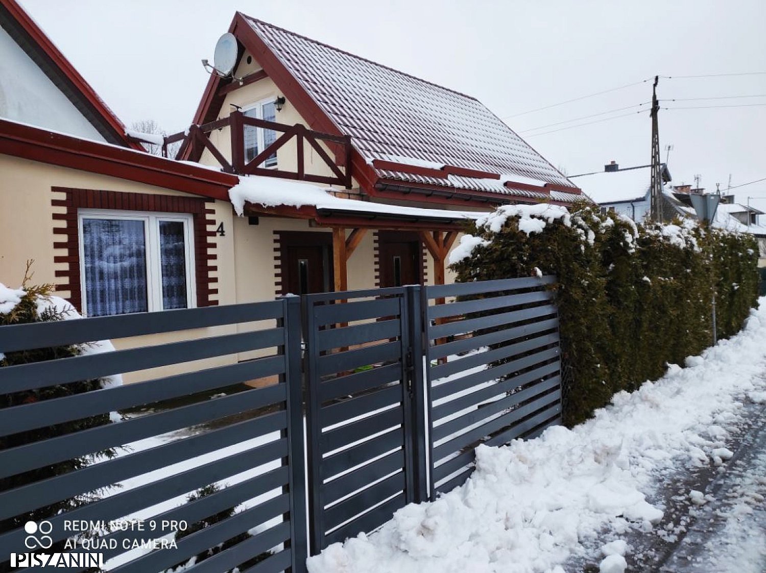 Dom stoi na ogrodzonej działce w kształcie prostokąta o powierzchni około 400 m².