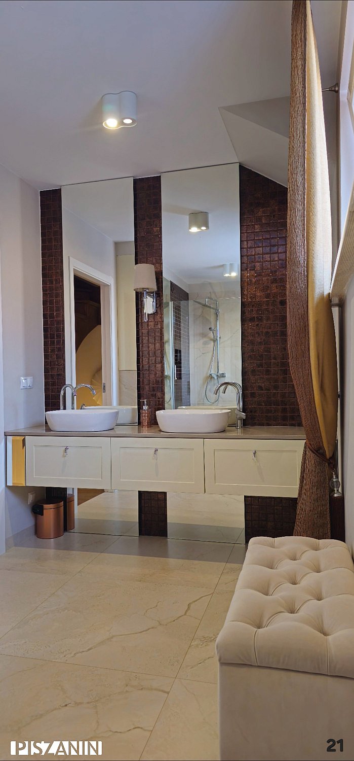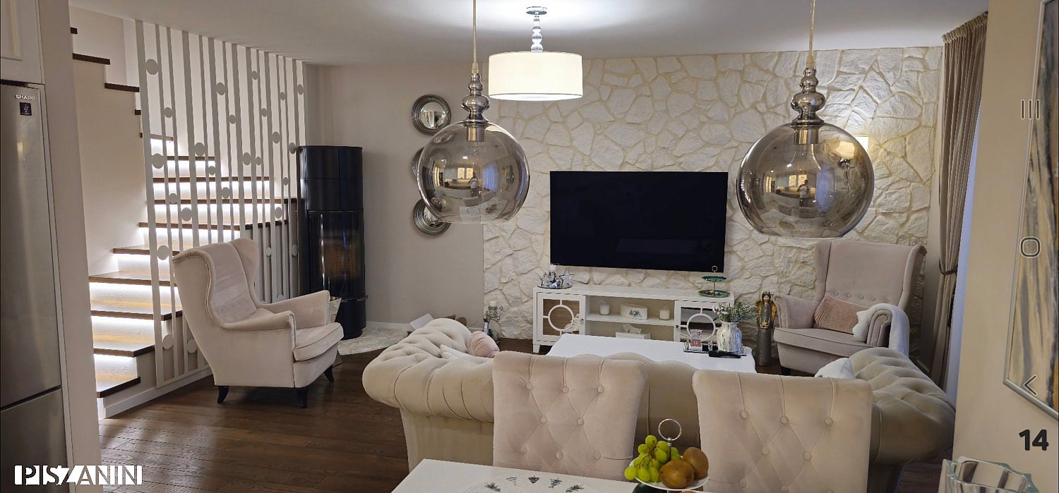 Dom urządzony w eleganckim, ponadczasowym stylu glamour. Kolorystyka wnętrz oraz zastosowane kamienne płyty podłogowe zdobyły I miejsce na wystawie w Mediolanie, co podkreśla jego unikatowy charakter.