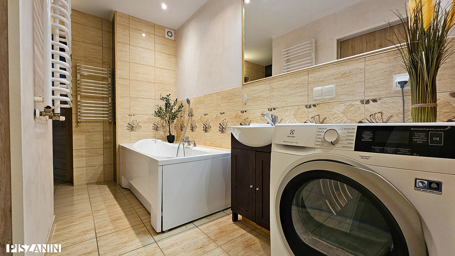 Dużym atutem jest zadaszony taras ok. 18 m² (3 × 6 m) z konstrukcją drewnianą i podłogą z kostki brukowej oraz ogród.