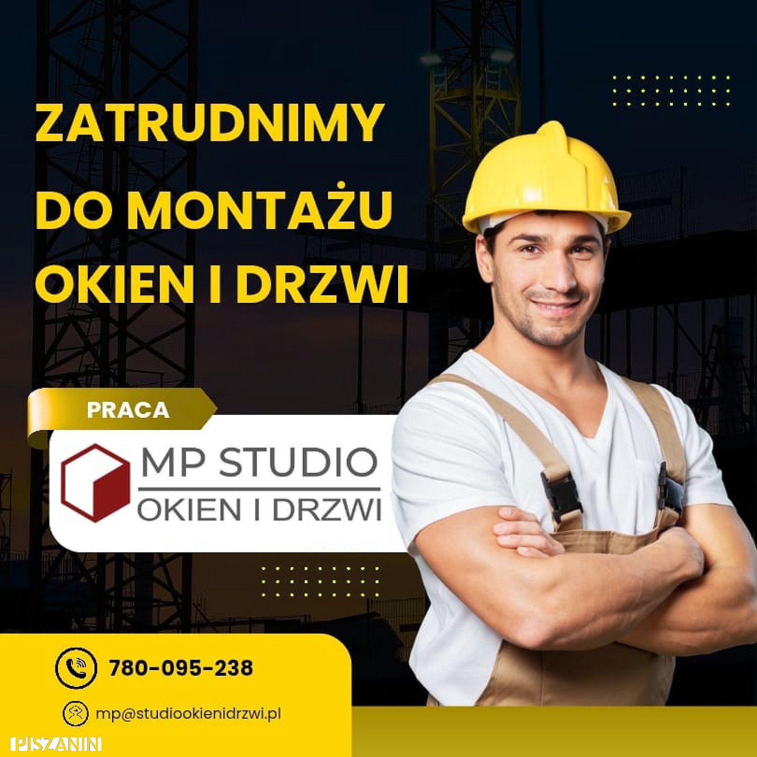 Zatrudnimy montażystę stolarki okiennej i drzwiowej! Zapraszamy do składania ofert! Więcej informacji pod nr tel. 780 095 238 lub w biurze MP STUDIO ul. Czerniewskiego 1A, Pisz.