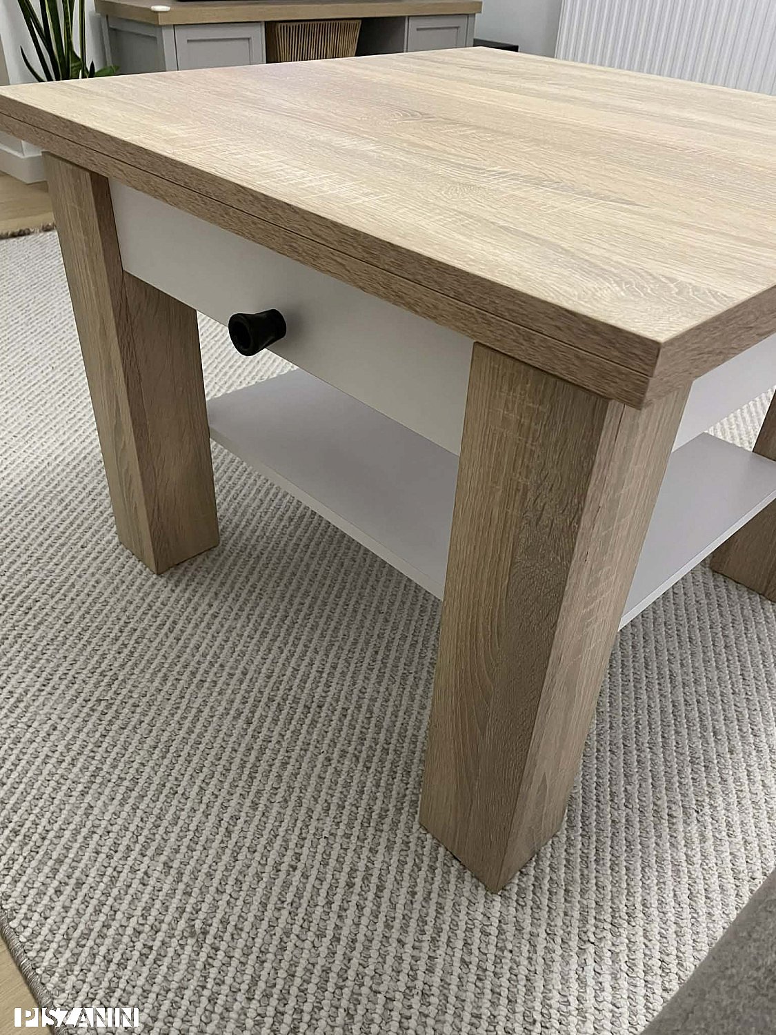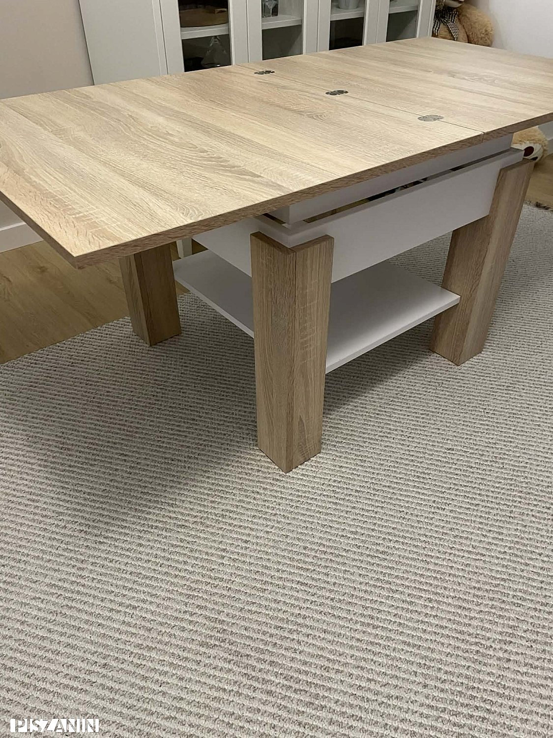 Stan bardzo dobry, wada fabryczna – niewielkie uszkodzenie krawędzi blatu (widoczne na 1. zdjęciu). Wada estetyczna, nie wpływa na użytkowanie.