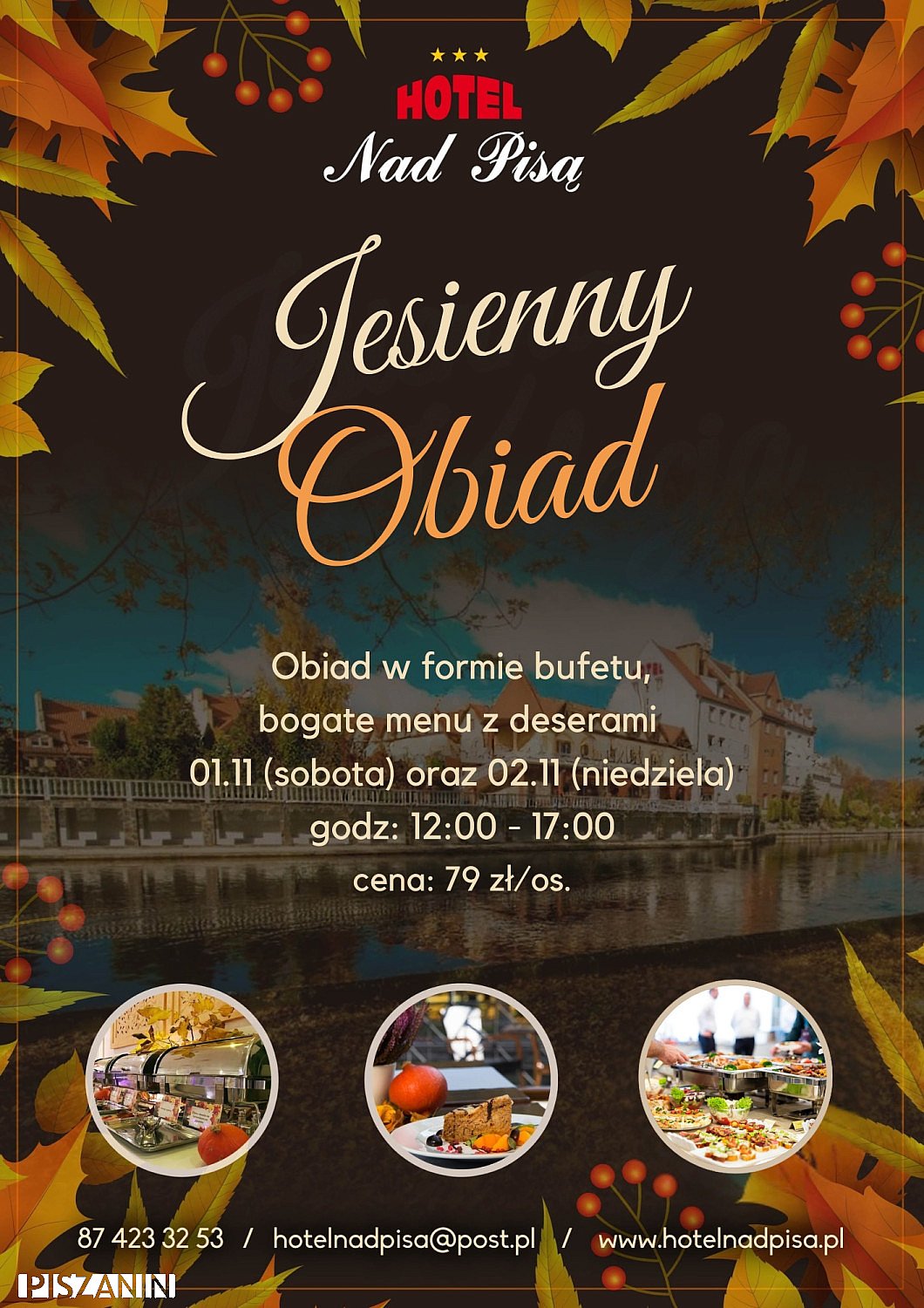 Dzień dobry. Zapraszamy na pyszny obiad do Restauracji w Hotelu Nad Pisą w dniach 01.11 (sobota) oraz 02.11 (niedziela) od 12:00 do 17:00 w cenie 79 zł/ osoba.