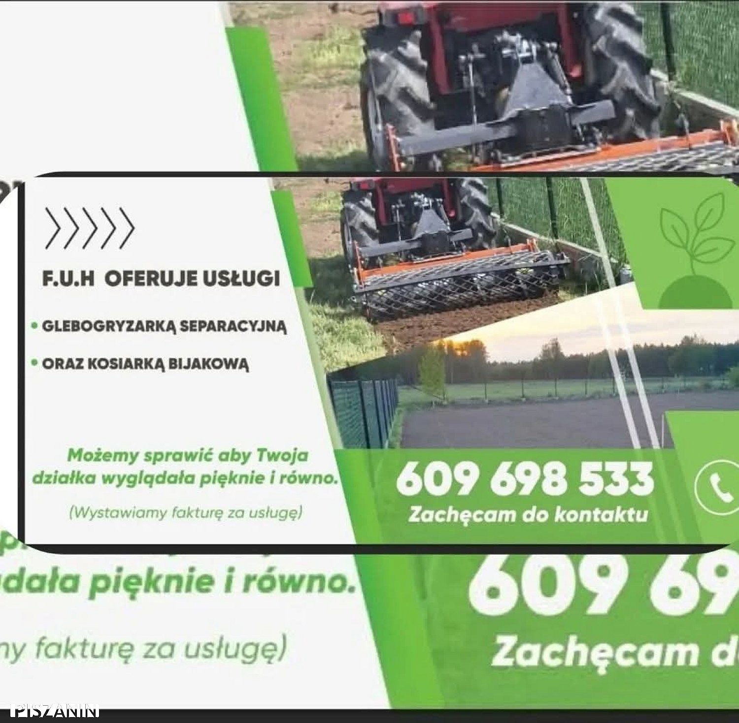 Firma usługowo handlowa świadczy usługi glebogryzarką Separacyjną dodatkowo usługa wysiewu trawy oraz jej koszenia. Wystawiamy Fakturę vat za usługi. Wycena indywidualna.