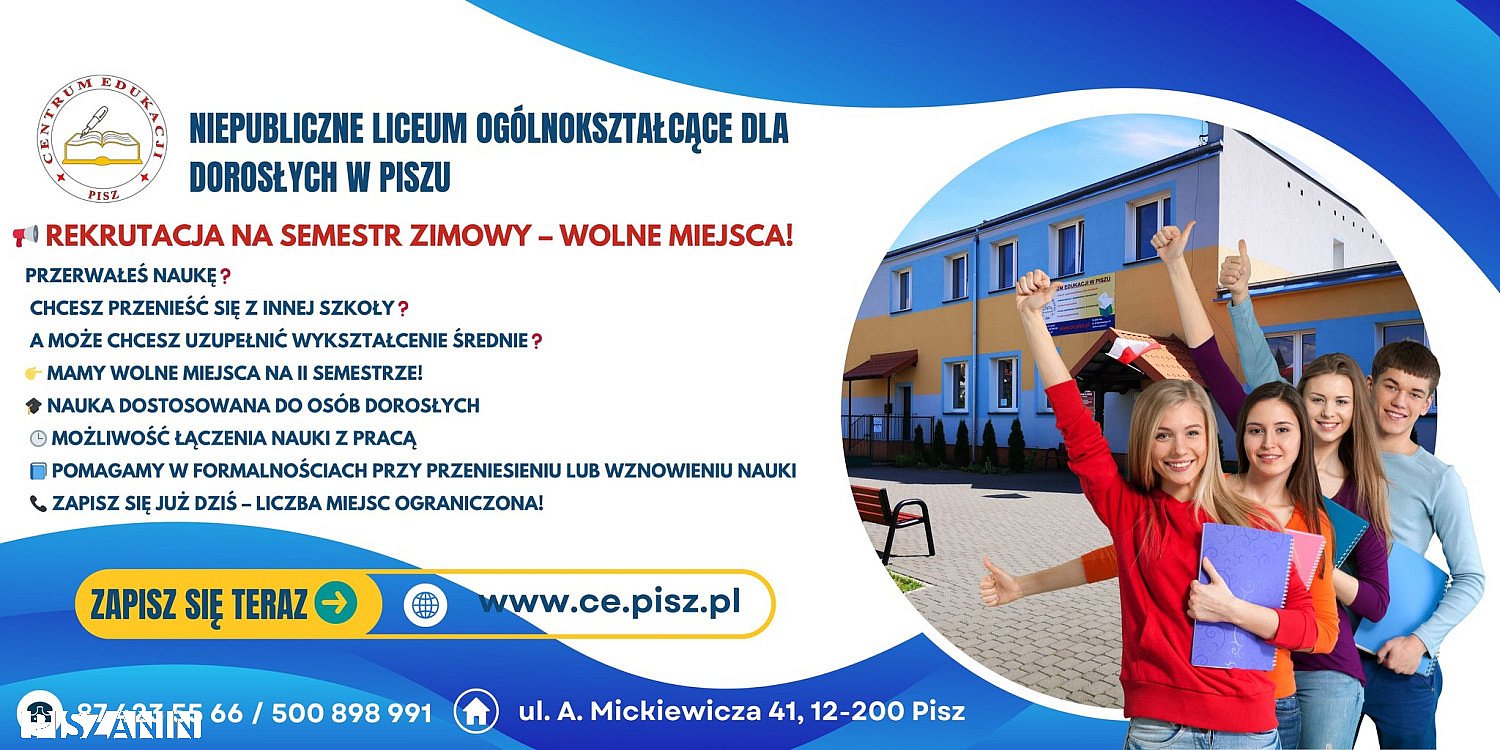 Trwa nabór uzupełniający w Niepublicznym Liceum Ogólnokształcącym dla Dorosłych w Piszu. Dokumenty rekrutacyjne dostępne są na stronie szkoły ce.pisz.pl oraz w sekretariacie. Zapraszamy!