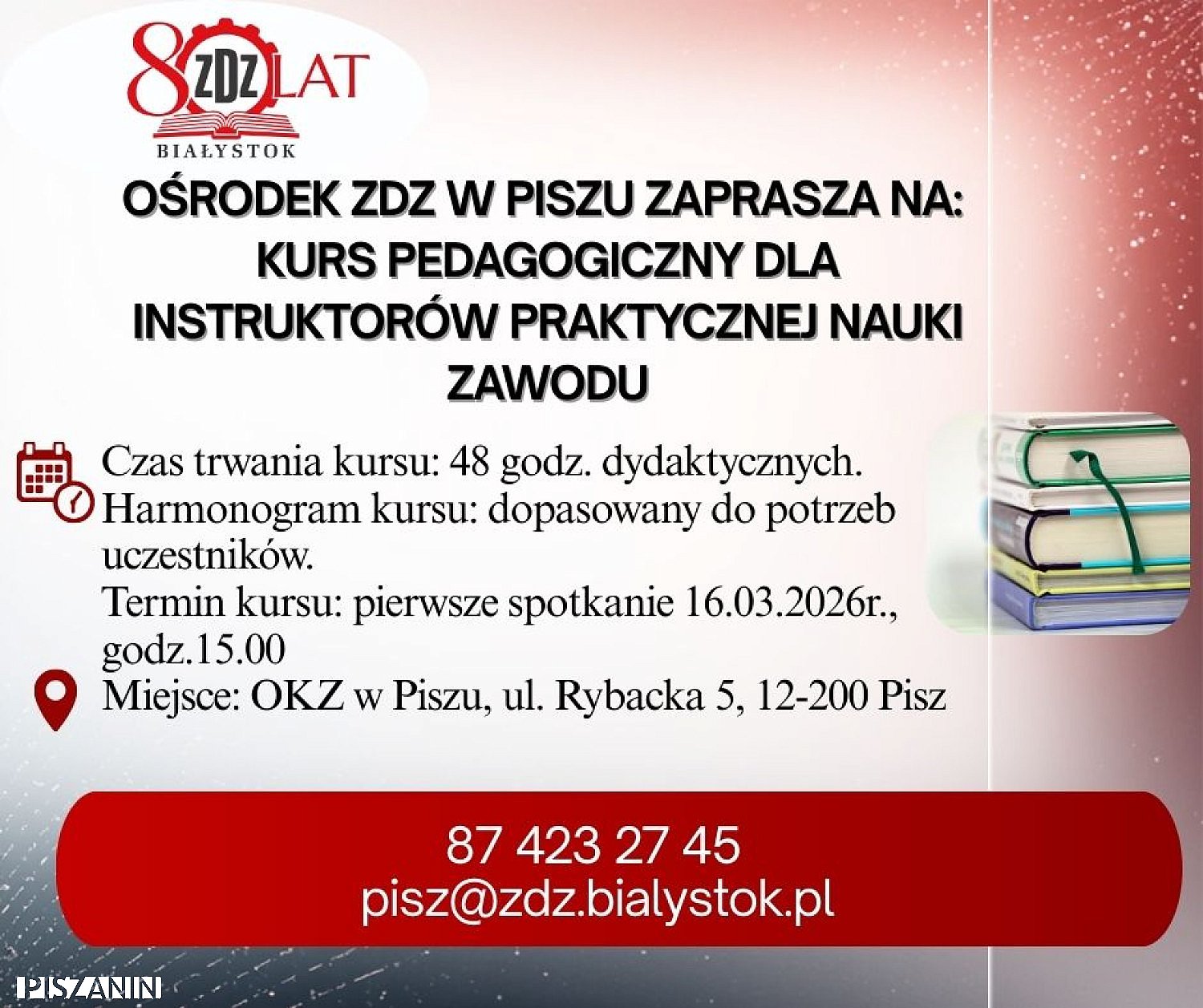 OKZ w Piszu zaprasza na Kurs pedagogiczny dla instruktorów praktycznej nauki zawodu w zakładach pracy. Celem kursu jest nabycie przez słuchaczy wiedzy i umiejętności z zakresu podstaw pedagogiki, psychologii, metodyki i praktyki metodycznej, zgodnie z § 10 ust. 4 Rozporządzenia Ministra Edukacji Narodowej z dnia 15 grudnia 2010 r.